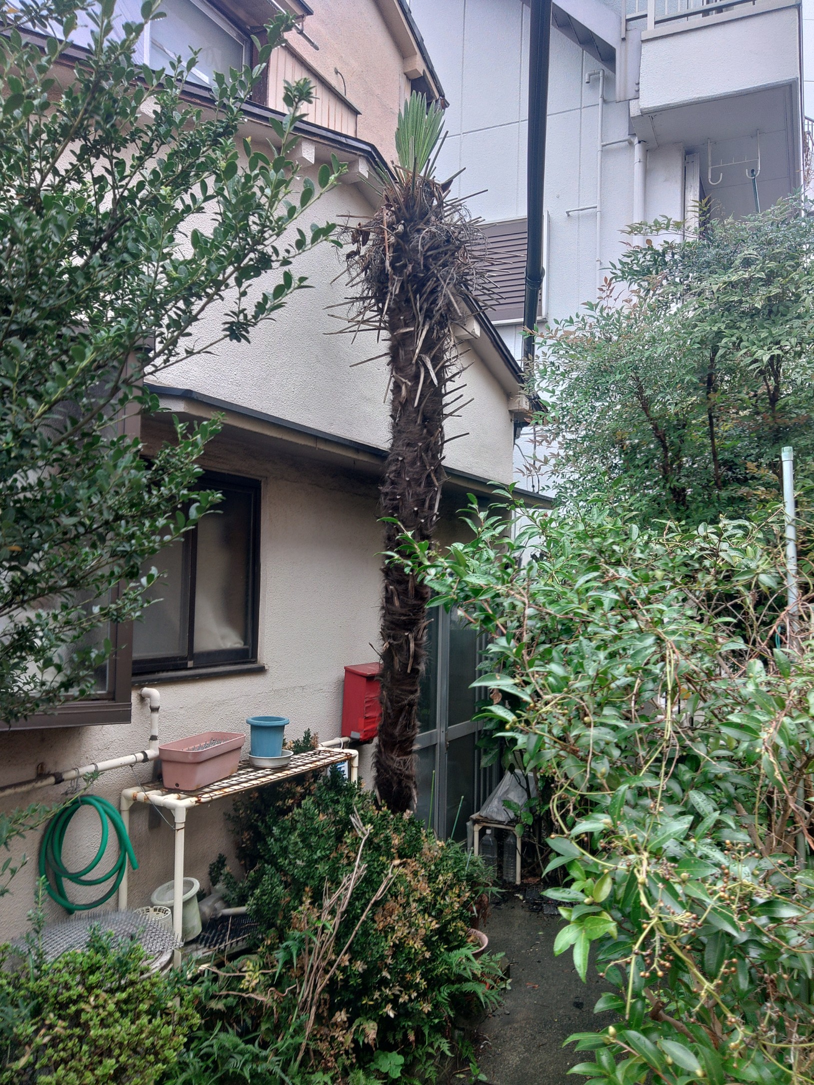 東京都葛飾区でシュロの伐採、ナギイカダの刈込を行いました。